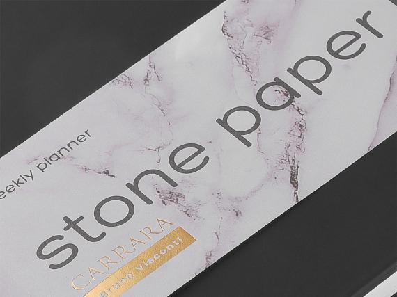 Недатированный еженедельник Carrara ТМ Bruno Visconti во всем уникален. Блок произведен из каменной бумаги плотностью 144 г/кв.м, отличающейся особой гладкостью и повышенной прочностью. Она не боится воды и пролитого кофе, достаточно просто протереть сухой салфеткой. Специально разработанная сетка блока, включает в себя и планер на год, и трендовую справочную информацию, и помесячный развернутый план, и основной блок из плана на неделю. Удобный для еженедельника квадратный формат А5+, обложка из искусственной кожи Soft Touch, блок из каменной бумаги — превосходное предложение! Тиснение (Блинт) на данный товар осуществляется бесплатно. Оплачивается только настройка оборудования в размере 6200 рублей на весь тираж.